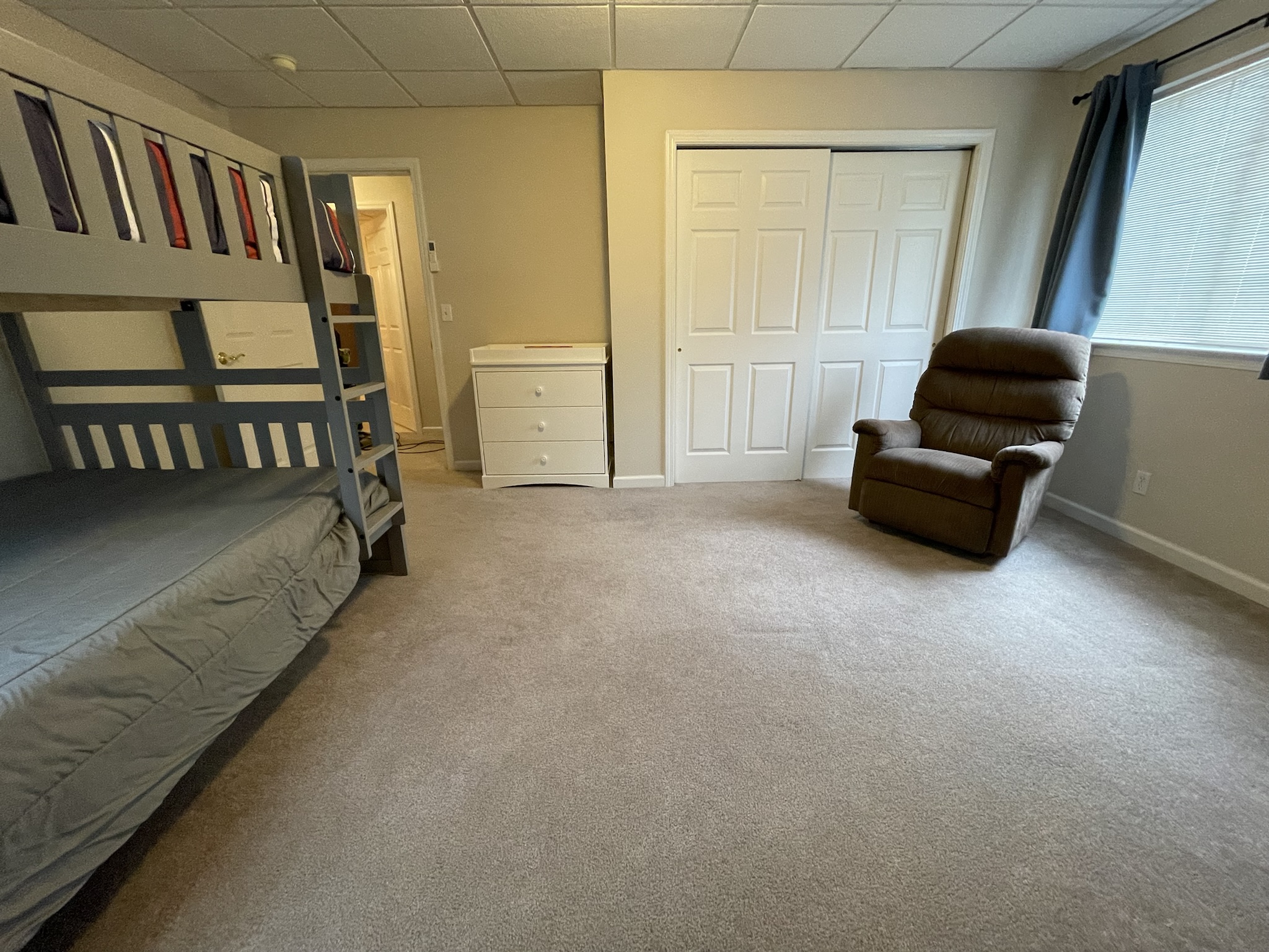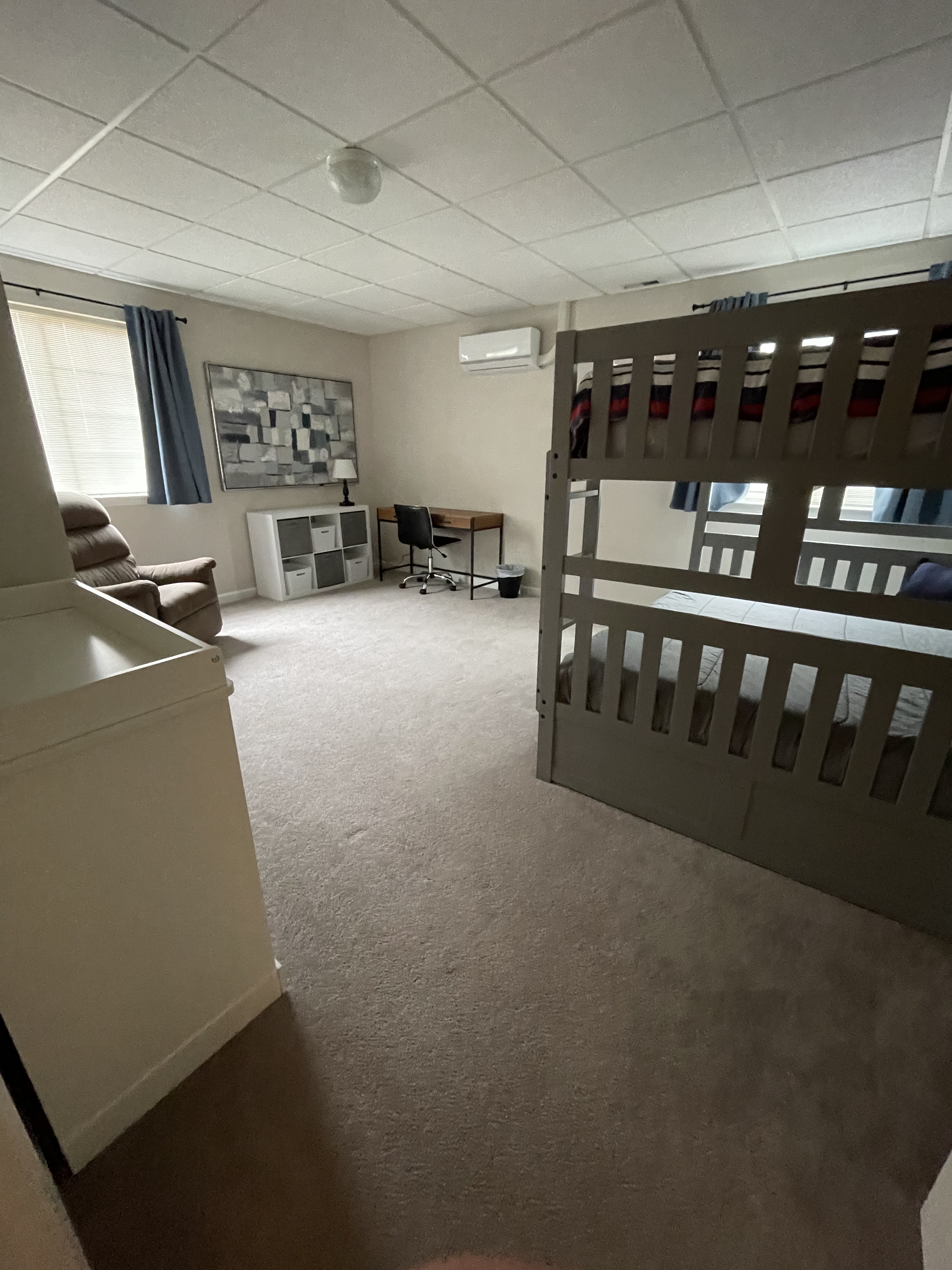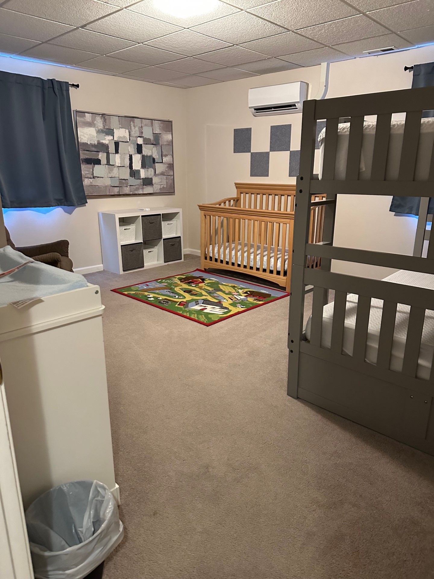 The family apartment is located on the lower level of the Valley View house. It has two large bedrooms. Bedroom 1 has a queen size bed while the 2nd bedroom caters to children with a full size bunk bed, a crib and changing table. It has a fully furnished kitchen with tons of cabinet space and granite countertops and large living room for family fun. The laundry space has a stacked washer and dryer with large cabinets for extra storage. The family apartment has a fenced patio and back yard that is exclusively for the apartment. The large lower yard outside of the fence is shared with the upstairs tenants. Parking for the Apartment is on the street of our cul-de-sac.
